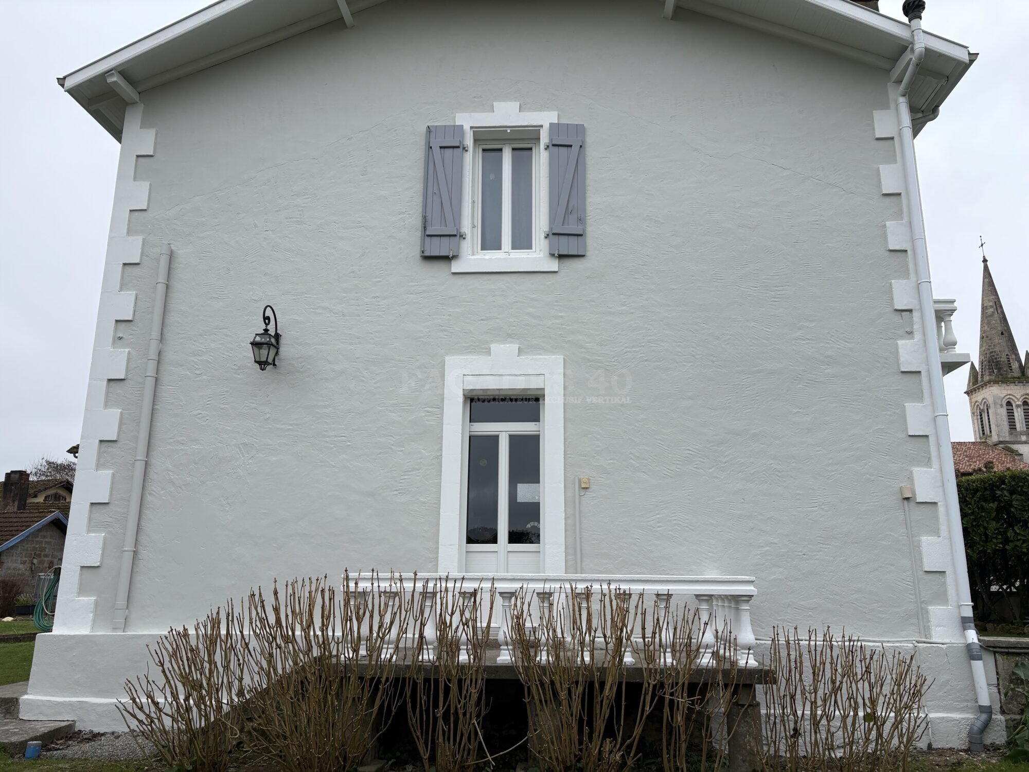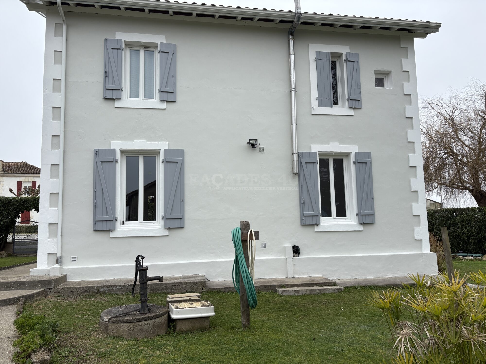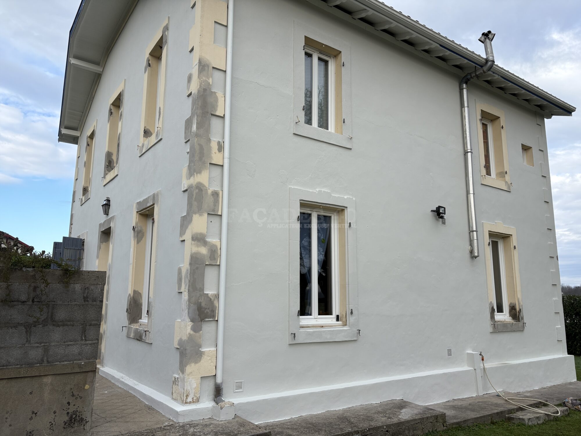 Pour ce chantier de ravalement de façade de maison individuelle à Onard, à proximité de Dax, notre équipe de façadier à mis en œuvre une méthodologie rigoureuse afin de garantir un résultat durable. Les façades ont d’abord fait l’objet de travaux préparatoires essentiels, comprenant le piquage des parties non adhérentes, la décontamination au VERTIKAL NETTOYANT I et le lavage complet des murs extérieurs. Les fissures existantes ont ensuite été ouvertes, grattées puis rebouchées avec le VERTIKAL FISSURES F afin d’assurer une surface saine et homogène. Un traitement spécifique avec le VERTIKAL STOP SEL a été appliqué pour neutraliser les remontées de sels minéraux et prévenir les dégradations futures. Une fois cette phase préparatoire terminée, la phase de finition a débuté par l’application d’un primaire d’accroche, le VERTIKAL CT,  indispensable pour optimiser l’adhérence des revêtements sur le support. Enfin, la mise en peinture a été réalisée avec un revêtement semi-épais, le VERTIKAL RSE 50, offrant une protection renforcée et une finition esthétique durable, limitant avec sa souplesse le retour du faïençage et des microfissures.