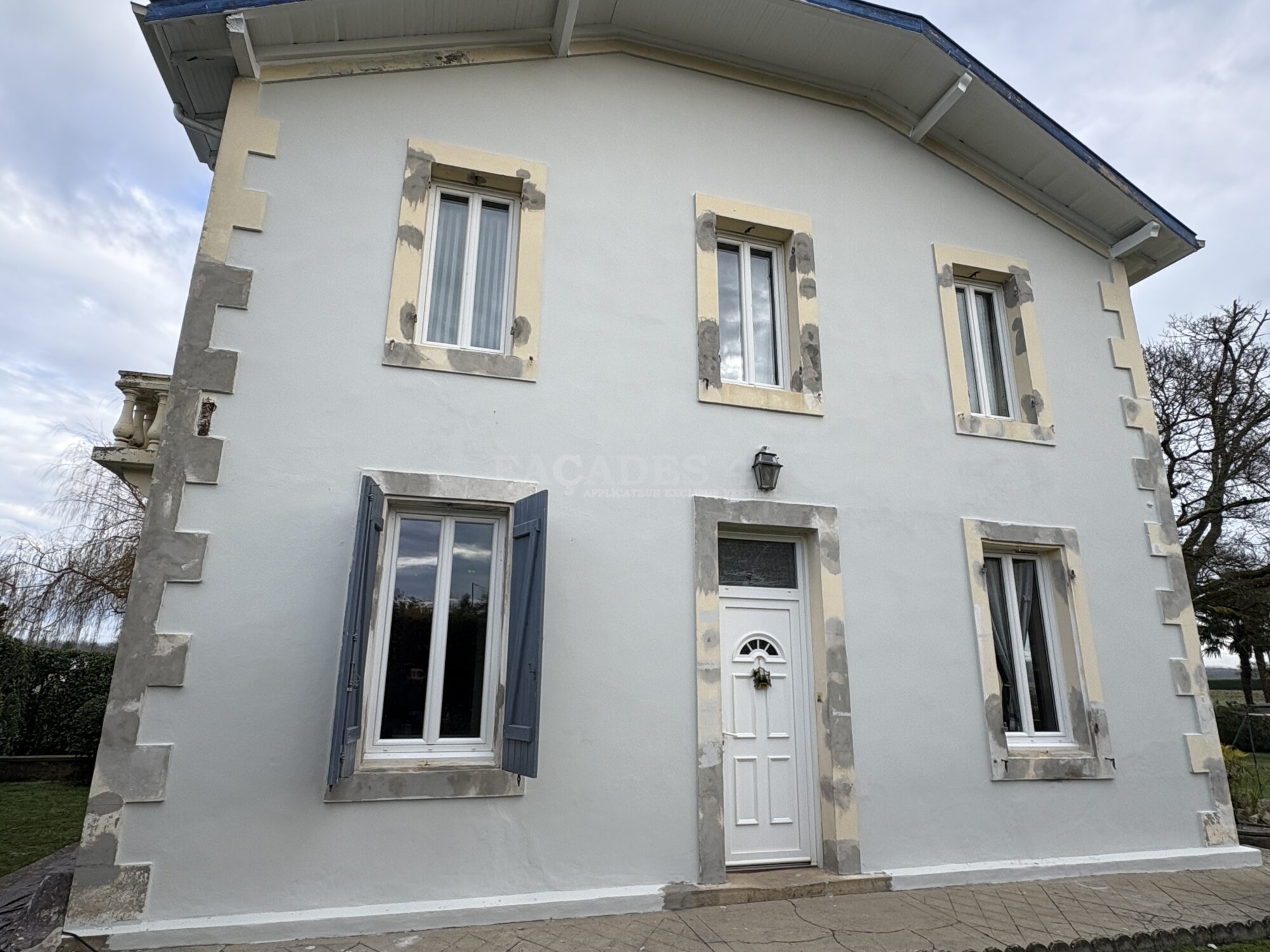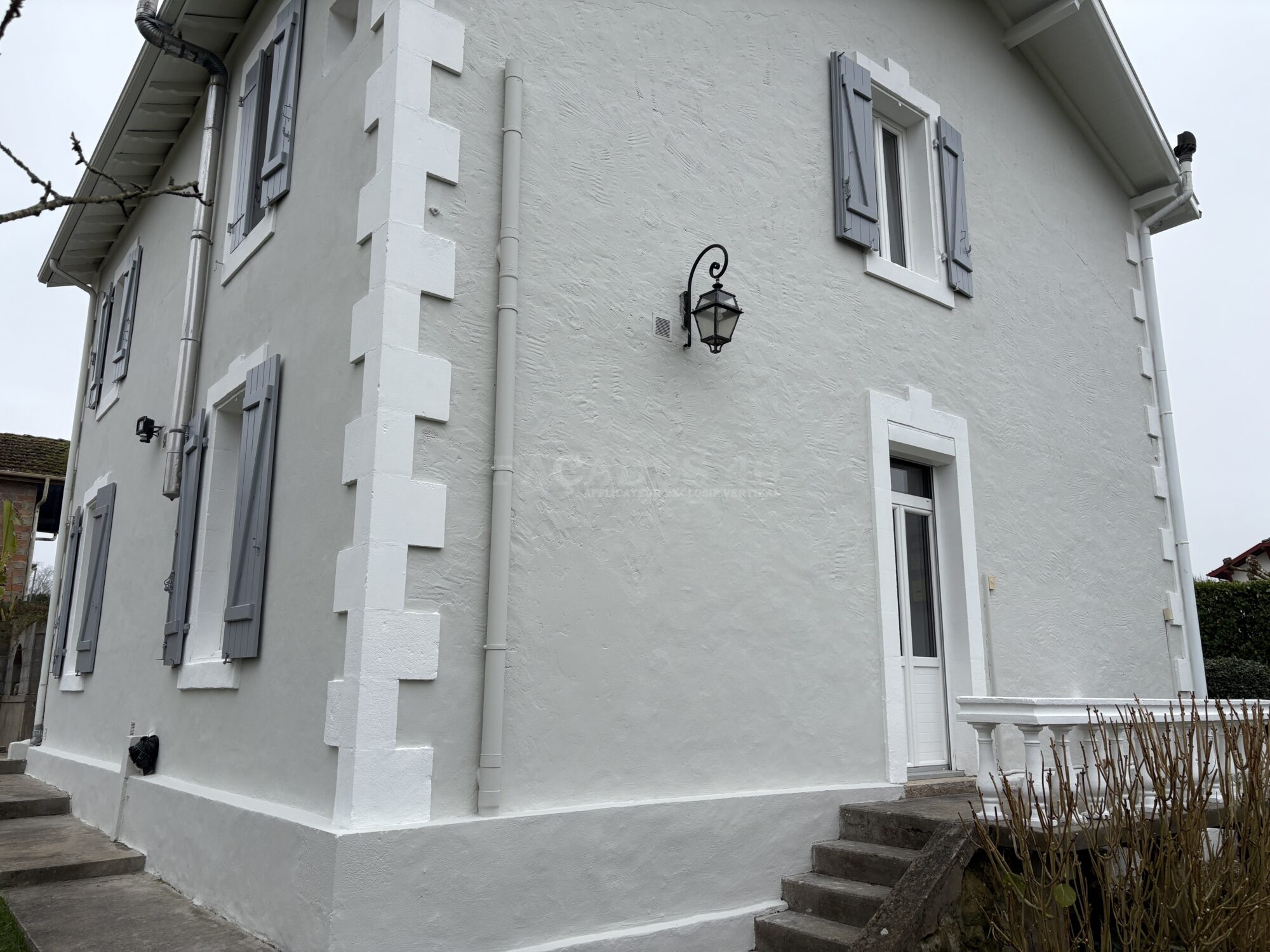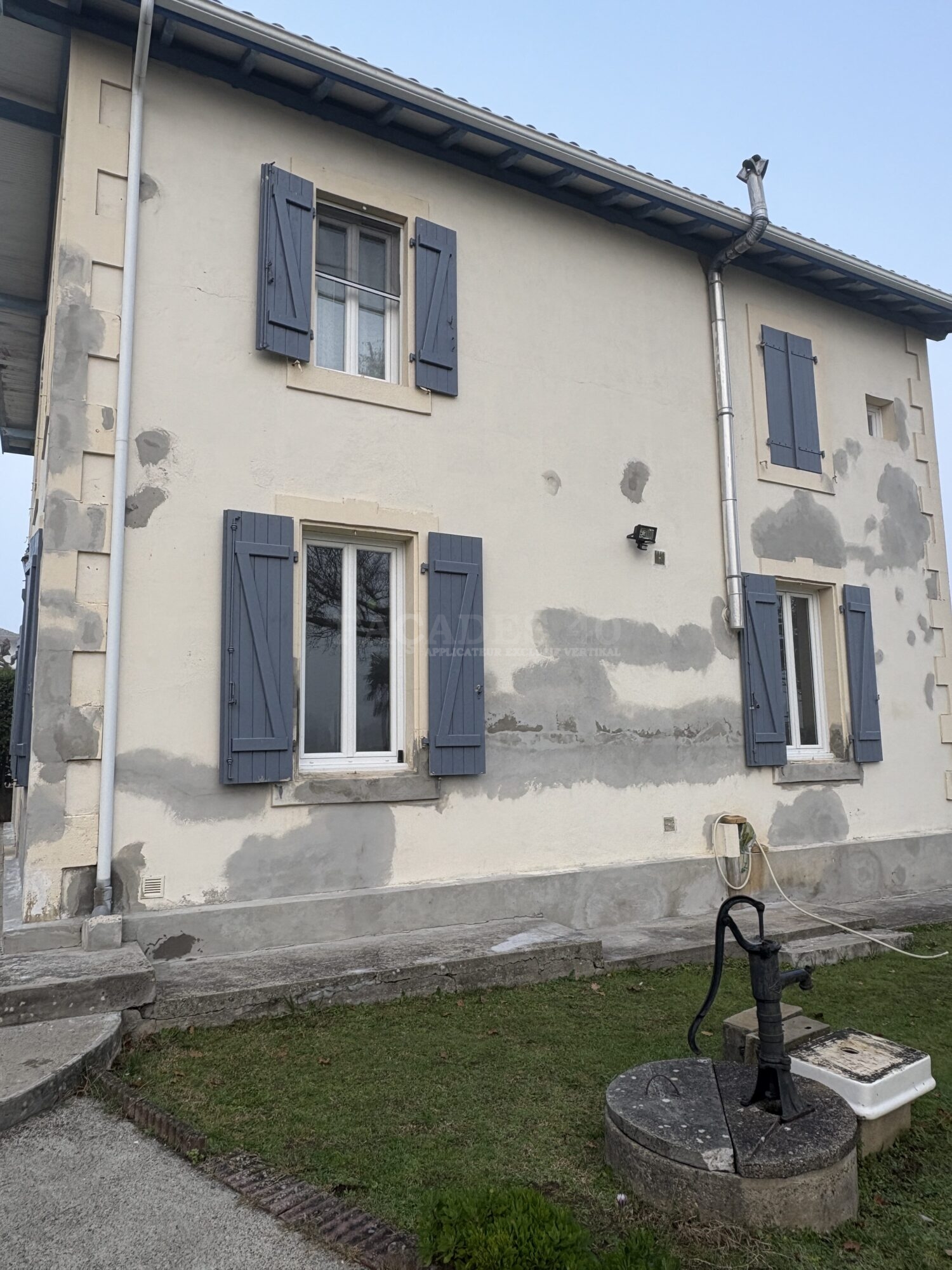 Pour ce chantier de ravalement de façade de maison individuelle à Onard, à proximité de Dax, notre équipe de façadier à mis en œuvre une méthodologie rigoureuse afin de garantir un résultat durable. Les façades ont d’abord fait l’objet de travaux préparatoires essentiels, comprenant le piquage des parties non adhérentes, la décontamination au VERTIKAL NETTOYANT I et le lavage complet des murs extérieurs. Les fissures existantes ont ensuite été ouvertes, grattées puis rebouchées avec le VERTIKAL FISSURES F afin d’assurer une surface saine et homogène. Un traitement spécifique avec le VERTIKAL STOP SEL a été appliqué pour neutraliser les remontées de sels minéraux et prévenir les dégradations futures. Une fois cette phase préparatoire terminée, la phase de finition a débuté par l’application d’un primaire d’accroche, le VERTIKAL CT,  indispensable pour optimiser l’adhérence des revêtements sur le support. Enfin, la mise en peinture a été réalisée avec un revêtement semi-épais, le VERTIKAL RSE 50, offrant une protection renforcée et une finition esthétique durable, limitant avec sa souplesse le retour du faïençage et des microfissures.