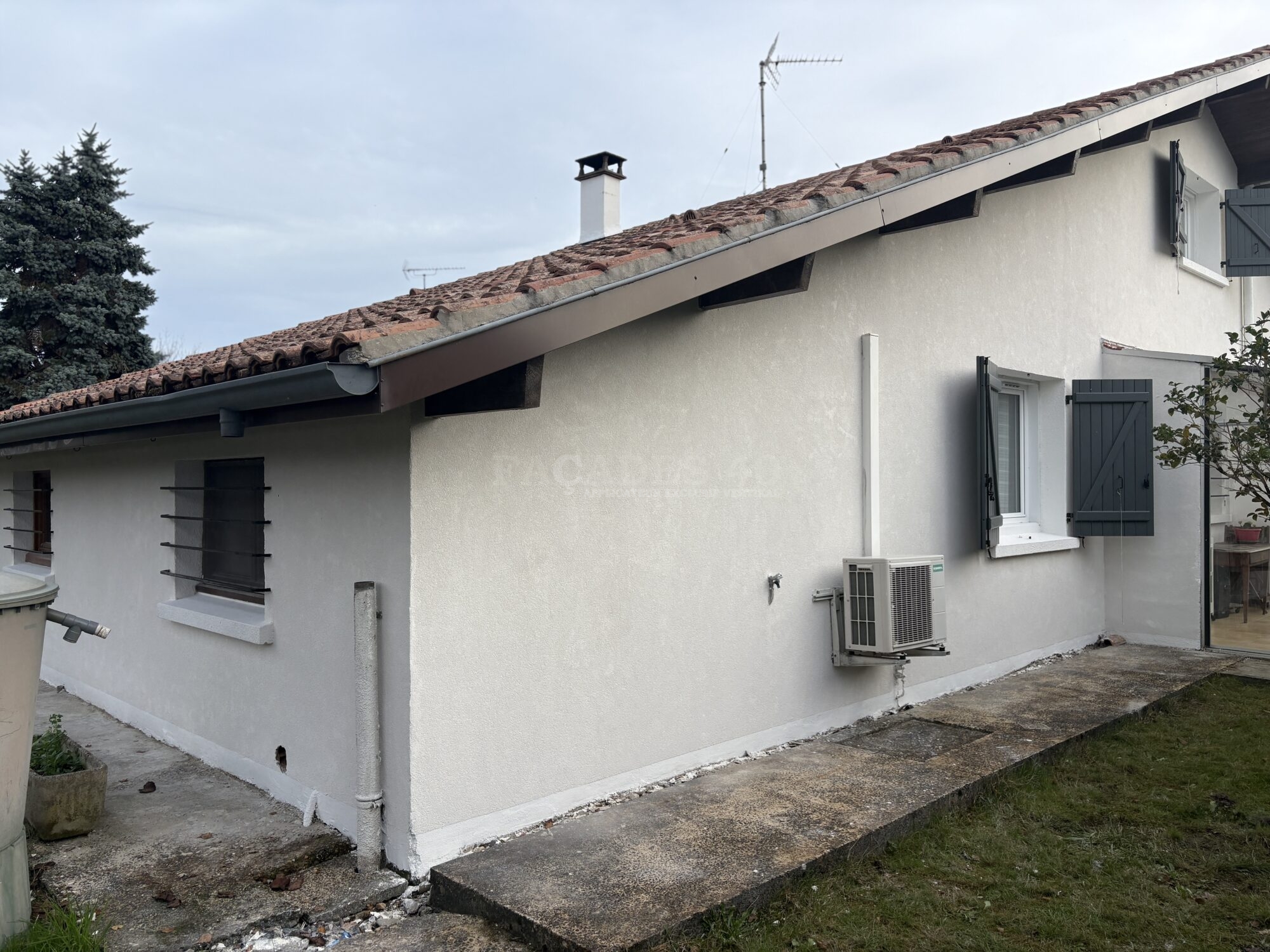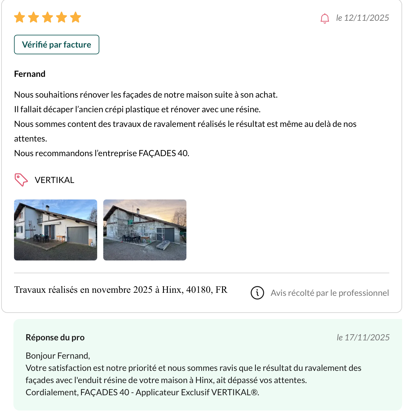 Nous souhaitions rénover les façades de notre maison suite à son achat. Il fallait décaper l’ancien crépi plastique et rénover avec une résine. Nous sommes content des travaux de ravalement réalisés le résultat est même au delà de nos attentes. Nous recommandons l’entreprise FAÇADES 40.