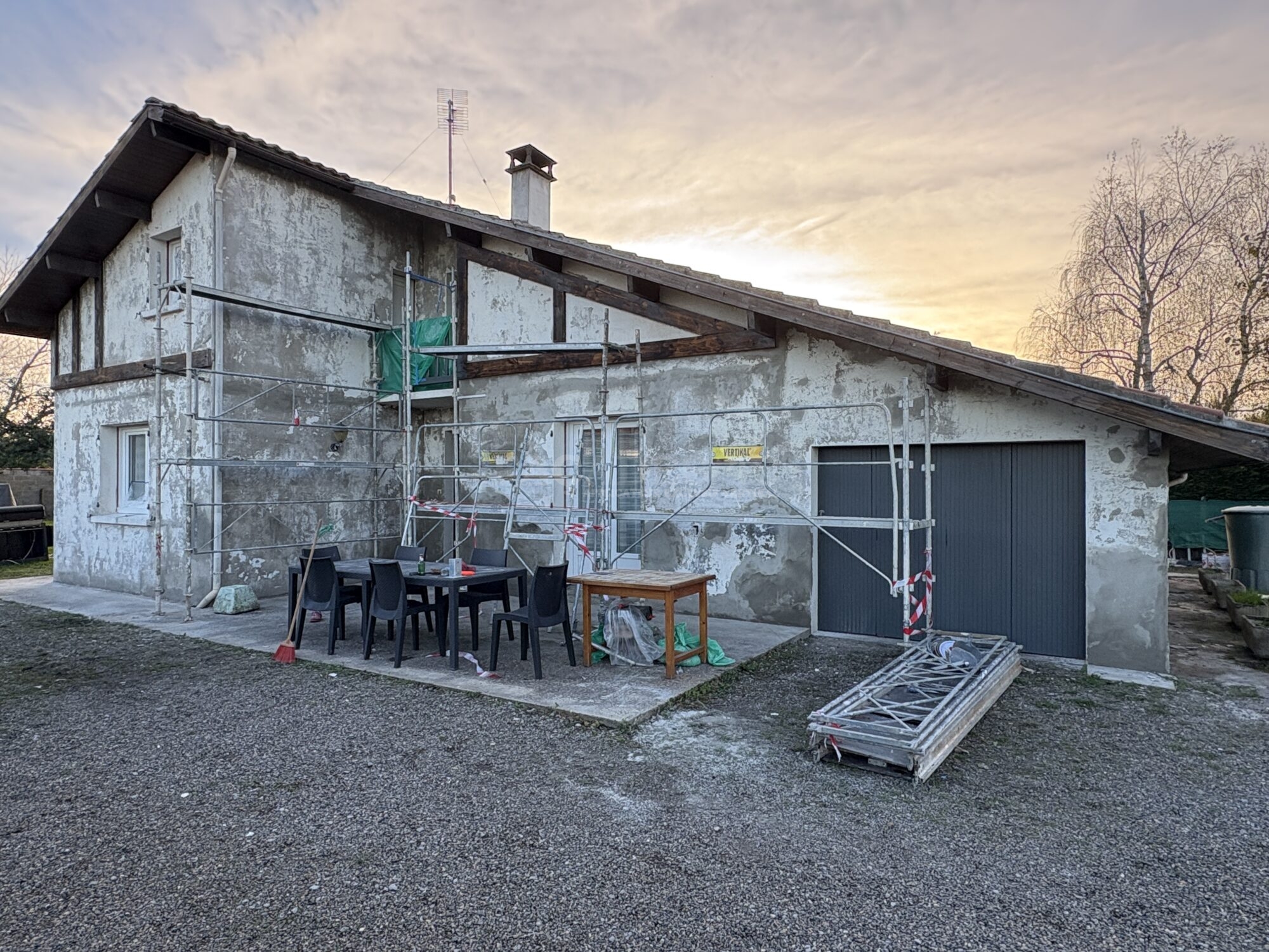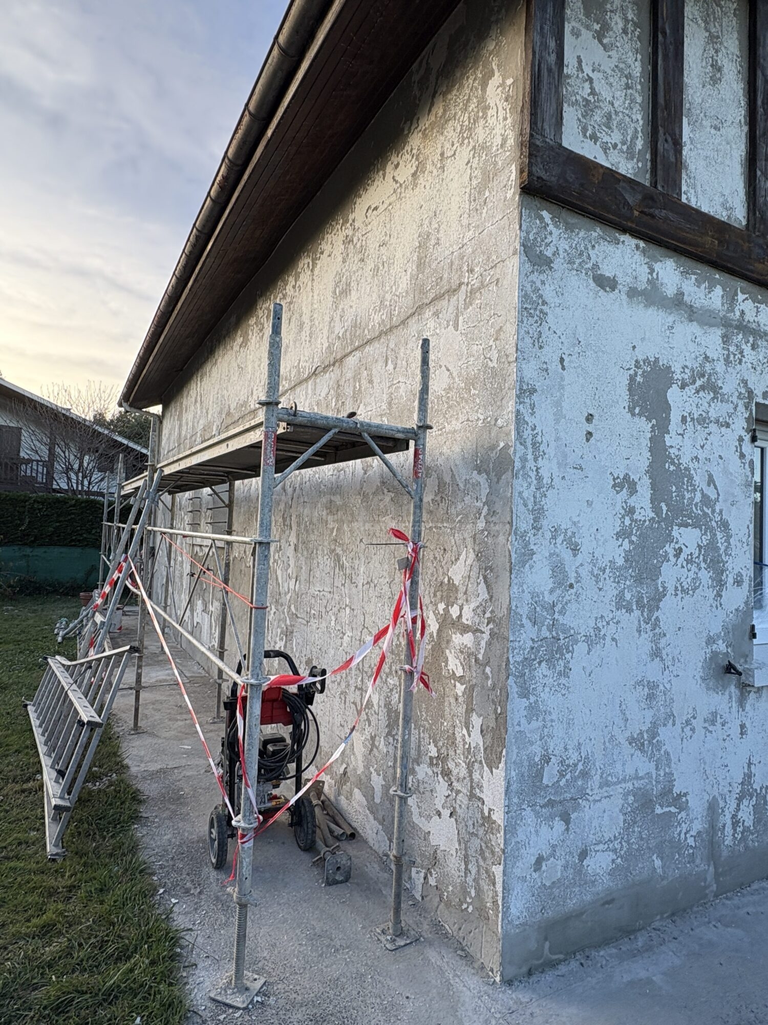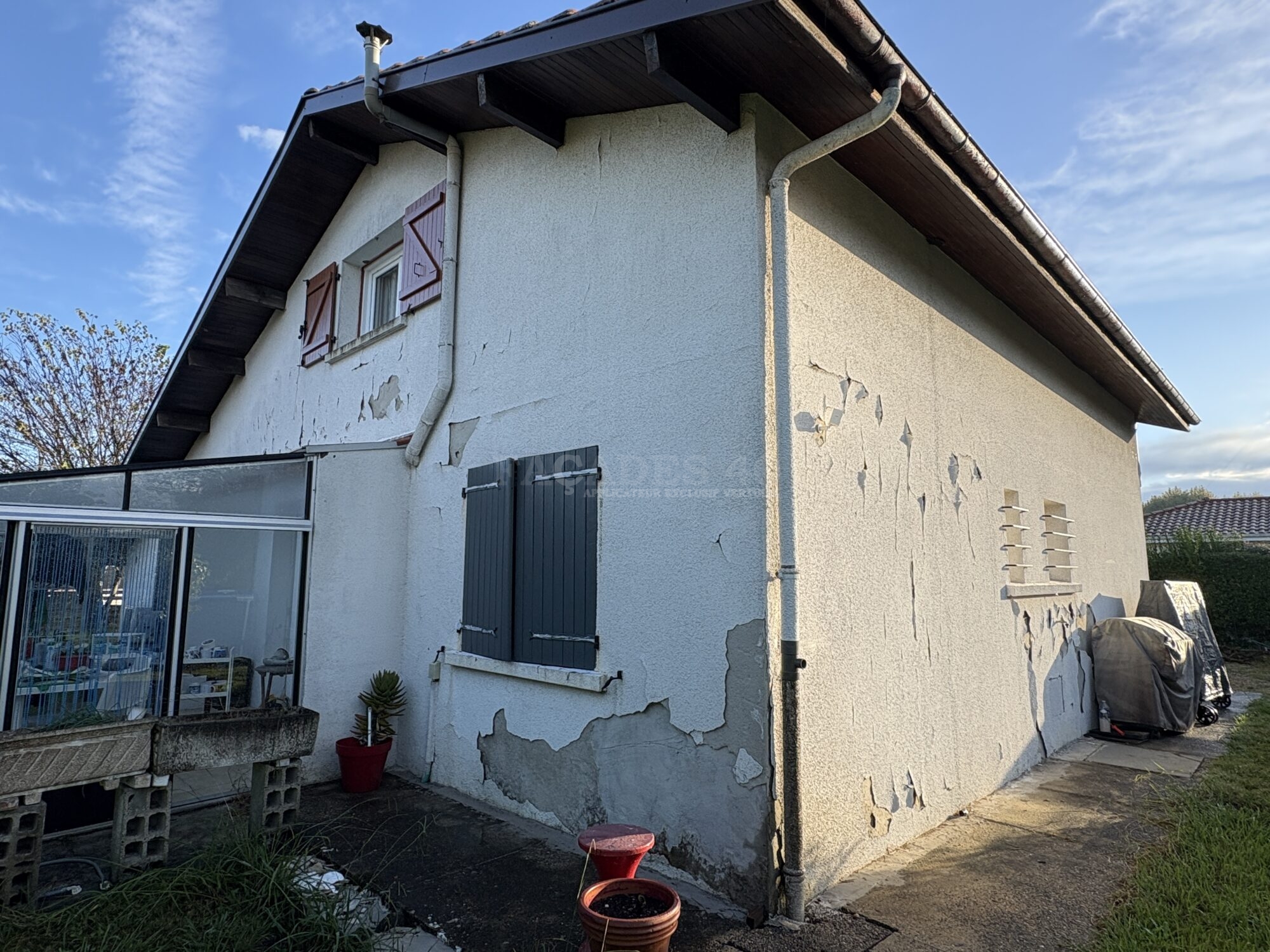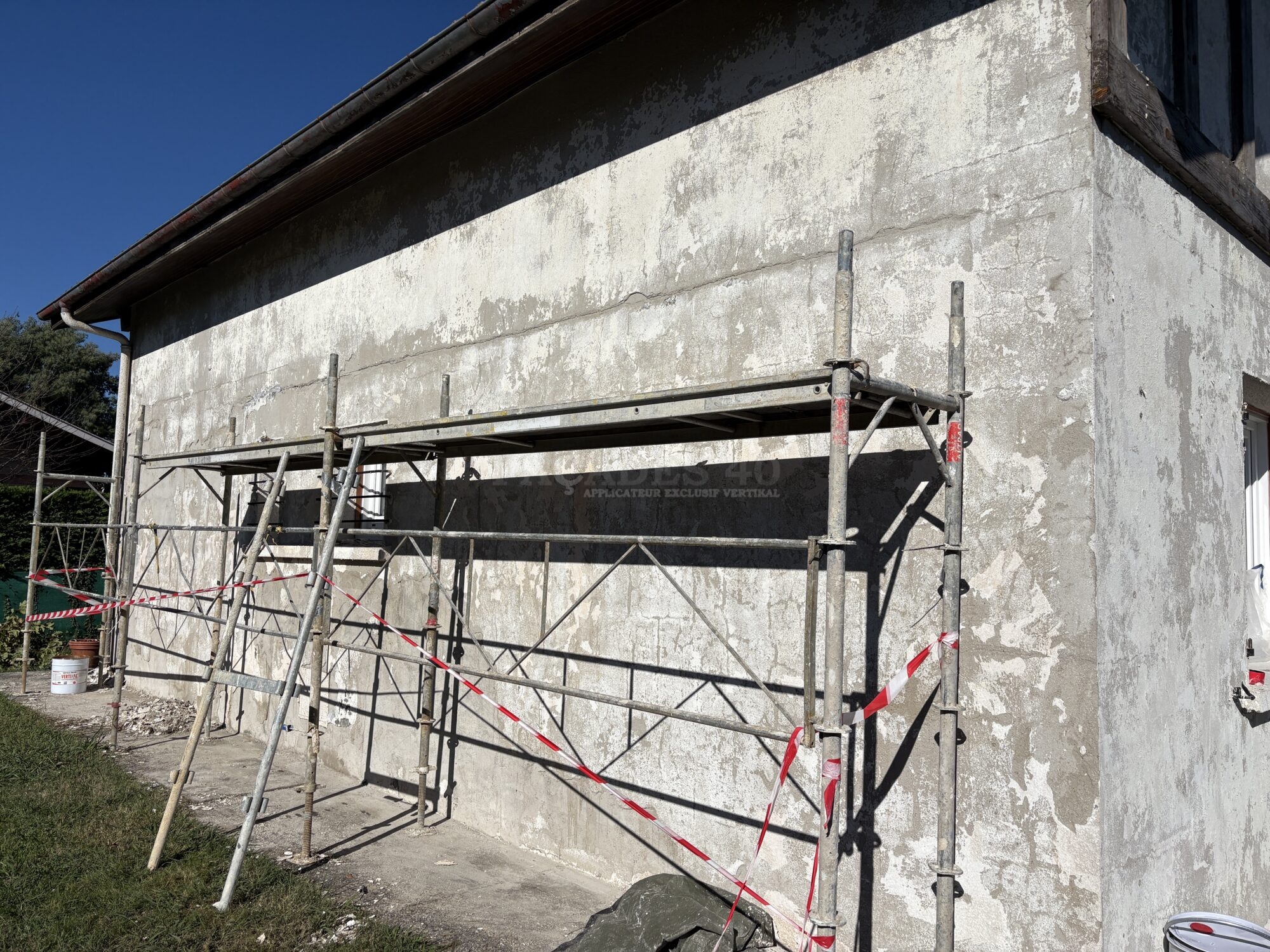 Lors de notre premier rendez-vous, nous avons analysé en détail le revêtement de façade présent sur les murs de la maison à Hinx. Nous sommes rapidement arrivés à la conclusion qu’il était impossible de travailler sur cet ancien revêtement plastique épais. Non seulement il empêchait les murs de respirer correctement, mais il était également totalement écaillé et présentait de nombreuses cloques, compromettant ainsi la durabilité d’un futur ravalement.
