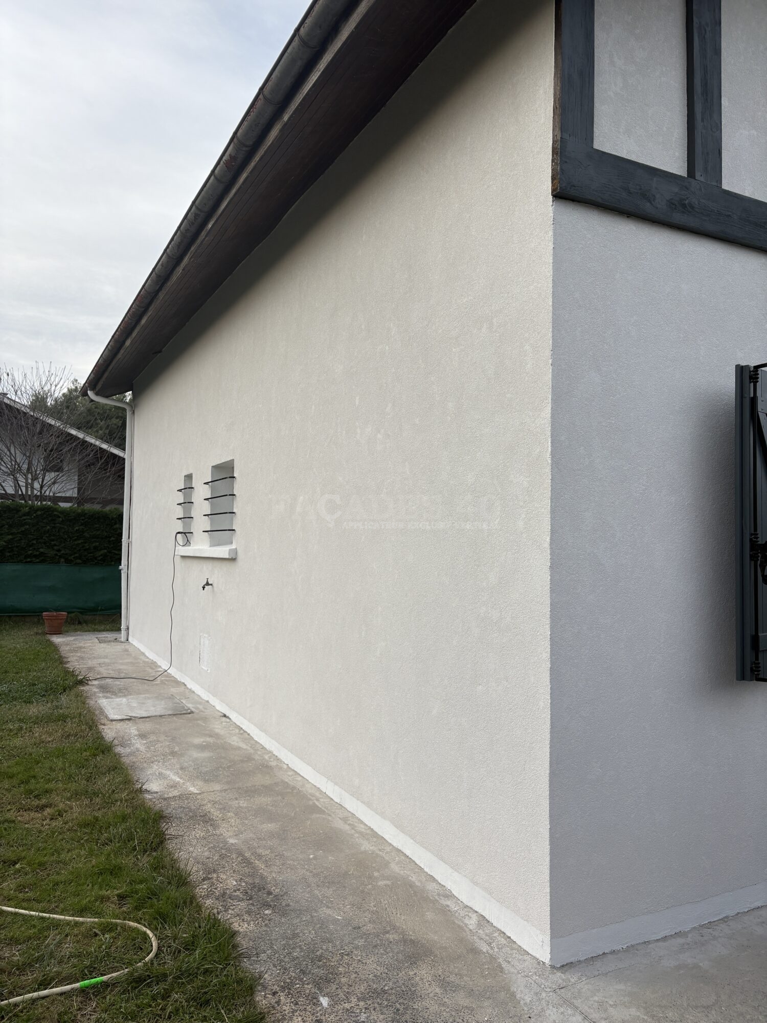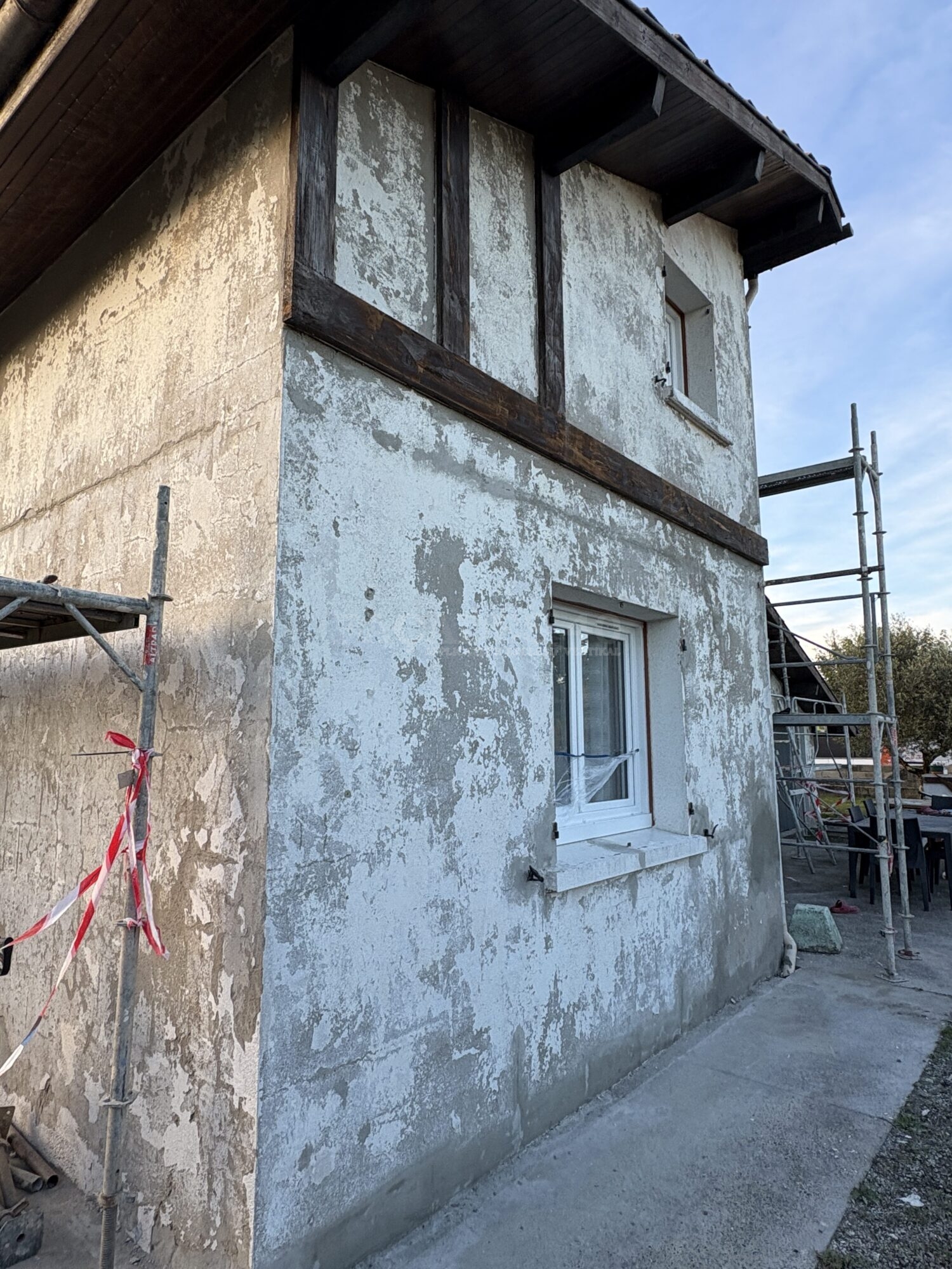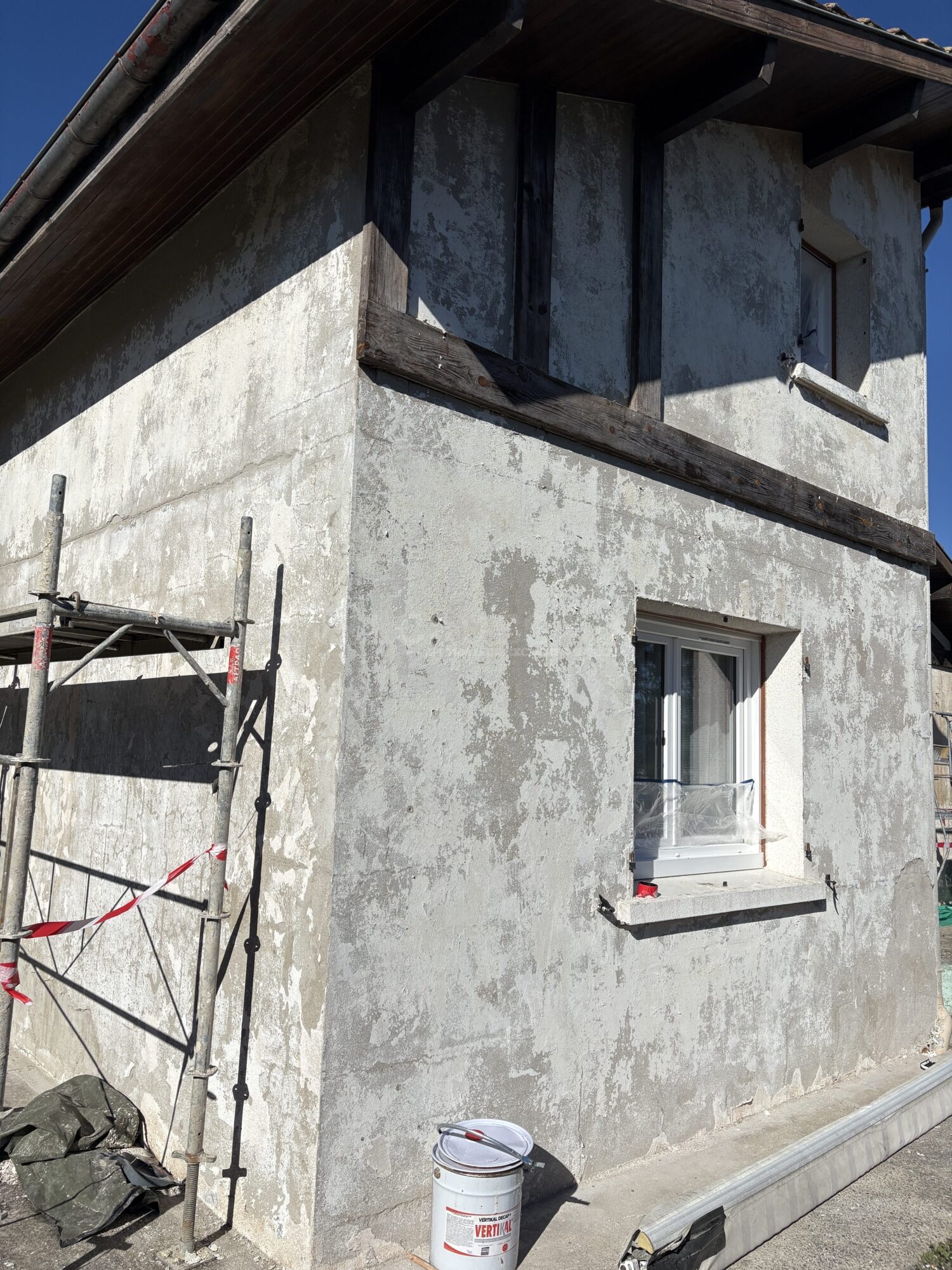 Pour garantir un résultat fiable et esthétique, il devenait indispensable de décaper intégralement les façades avant d’appliquer un nouveau système de revêtement. Nous devions aussi tenir compte du souhait des futurs propriétaires, à savoir obtenir une façade propre, uniforme et quasiment neuve. Dans cette optique, l’utilisation d’une gamme de produits épais structurés s’est révélée la solution la plus adaptée. Le crépi résine, grâce à sa capacité à corriger les défauts de planéité et les différences de matière, permet d’obtenir une finition durable, moderne et conforme aux exigences esthétiques du projet. Ce choix assure également une protection renforcée face aux intempéries et à l’usure quotidienne.
